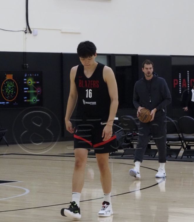 开拓者队内训练里,杨瀚森在跑战术,先是跑到弧顶,接到助教传球之后出手三分,杨瀚森2次出手弧顶三分全部打铁。接下来又回到底角位置去投三分,底角位置杨瀚森第一轮出手2次也只命中了1球,跟他一组的里斯投得那可是非常准的。